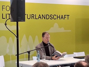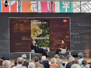 Auf der Bühne in der Glashalle stellte Maxim Leo sein Buch „Einatmen – Ausatmen“ vor. In dem Roman geht es um Achtsamkeit und es sollte eigentlich ein lustiges Buch werden. Aber durch die ganzen Methoden, die er im Rahmen der Recherche kennengelernt hat, ist es erst zu einem ernsten Thema geworden. Im Namen der Achtsamkeit kann viel Druck aufgebaut werden, so der Autor. Es gibt viele tolle Sachen mit denen man arbeiten kann, aber wenn dabei Druck entsteht, kann es herausfordernd werden. Dabei ist mit Humor das Leben leichter zu ertragen.